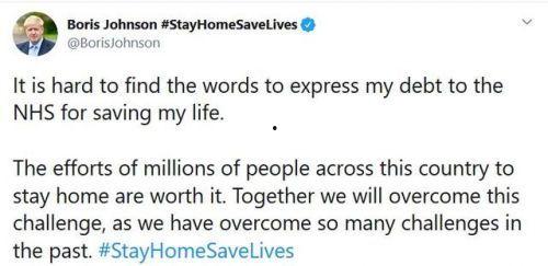 4. 关注民众:康复后,英国首相没有忘记关心民众,鼓励大家共同抗击疫情。